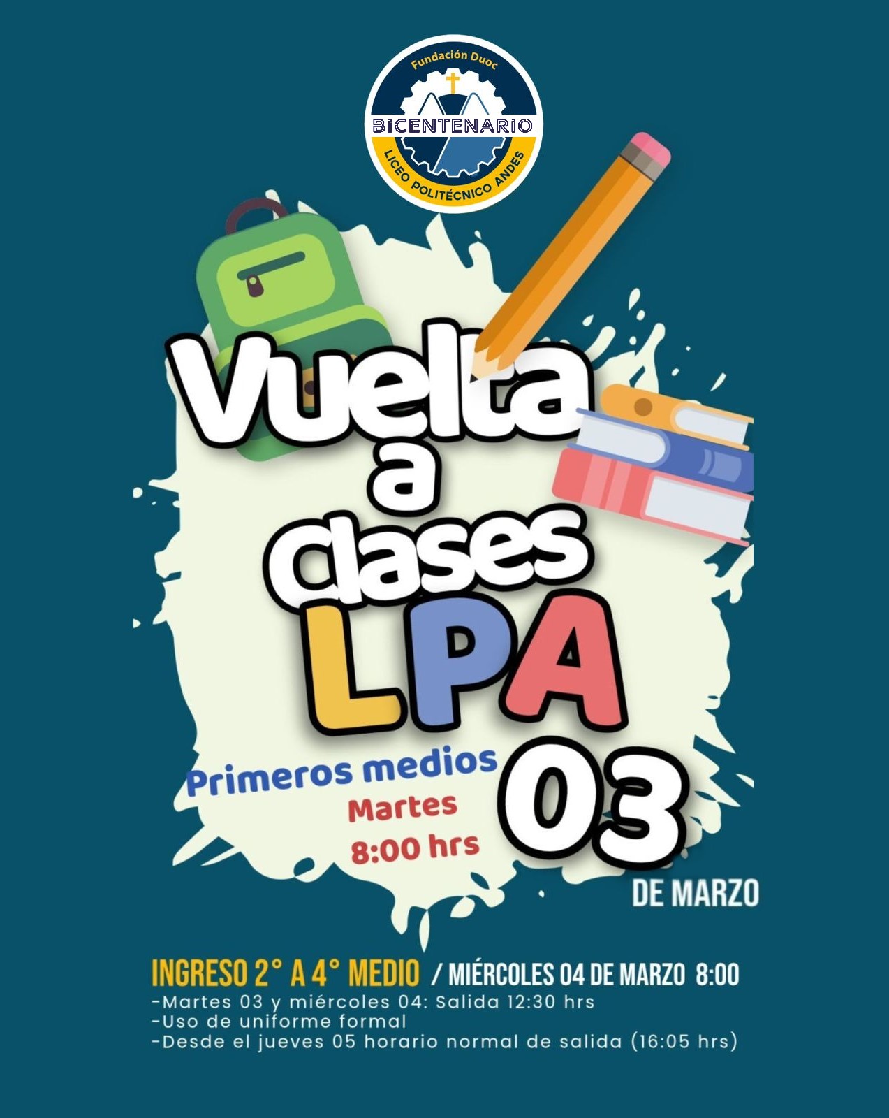 Viernes 24 de octubre de 2025 Estimados miembros de nuestra comunidad educativa: Junto con saludarles cordialmente, queremos compartir información relevante sobre el desarrollo de nuestro quehacer educativo en esta última etapa del año escolar. Seguridad y Convivencia Escolar: Durante las últimas semanas hemos fortalecido diversas acciones orientadas a resguardar la seguridad y el bienestar de nuestros estudiantes. Se están aplicando los protocolos correspondientes ante situaciones de conflicto, reforzando la contención y la mediación como herramientas fundamentales de resolución pacífica. Tambien les recordamos que se realizaron ajustes en los horarios de clases y recreos para favorecer un ambiente más seguro y ordenado. Dentro de estas acciones queremos agradecer especialmente la colaboración de Seguridad Ciudadana de Renca, quienes nos han acompañado en los horarios de ingreso y salida, comprendiendo que también deben atender otros sectores de la comuna. Durante el mes de noviembre, contaremos además con el apoyo de la Policía de Investigaciones (PDI), quienes realizarán charlas formativas, planificadas por el Área de Convivencia Escolar, orientadas a fortalecer la prevención, el autocuidado y la responsabilidad digital de nuestros estudiantes. 2. Jornada de Reflexión sobre Convivencia Escolar: El miércoles 29 de octubre se desarrollará una jornada de reflexión sobre convivencia escolar, en la que contaremos con la participación de representantes de los cursos y apoderados, además de profesores, paradocentes y el equipo de gestión. Ese día, los estudiantes finalizan la jornada escolar a las 12:30 horas. 3. Aniversario del Liceo: La próxima semana celebraremos de manera oficial un nuevo aniversario de nuestro Liceo Politécnico Andes. Eespecíficamente, el jueves 30 de octubre desde las 8:00 hasta las 12:30 hrs. Los estudiantes no deben traer mochilas, habrá Jeans Day y podrán disfrutar de stand de alimentos, actividades recreativas y formativas preparadas especialmente para ellos por el Centro de Estudiantes (CALPA). 4. Reuniones de Apoderados – Cierre escolar 2025: Los apoderados están convocados a las reuniones de apoderados de cierre escolar 2025, a las 19.00 hrs. en las siguientes fechas: 4°H – Lunes 27 de octubre 4°A – 4°B – 4°C – 4°D – 4°E – 4°F y 4°G – Martes 28 de octubre NIVELES 1° – 2° y 3°: – Martes 04 de noviembre Reiteramos que las instancias de Reunión de Apoderados es clave para revisar el rendimiento académico, la convivencia escolar y reforzar el trabajo conjunto entre familia y Liceo. 5. Prueba SIMCE 2° Medios 2025: Recordamos que los estudiantes de Segundo Medio rendirán las Pruebas SIMCE los martes 11 y miércoles 12 de noviembre. Esta evaluación permite conocer los avances en aprendizaje y fortalecer nuestras estrategias pedagógicas, por lo que solicitamos reforzar dentro de las familias las altas expectativas que tenemos respecto de su desempeño en esta instancia. 6. Compromiso Académico: Entramos en la etapa final del año escolar, donde es fundamental mantener el compromiso académico y la asistencia regular. Invitamos a los apoderados a acompañar a sus hijos e hijas en la preparación de las pruebas semestrales y en el cierre de sus procesos evaluativos. El calendario y los temarios de las pruebas semestrales se encuentra ya disponible en nuestro sitio web https://liceoandes.duoc.cl/ Antes de finalizar, les pedimos conversar con sus hijos e hijas en sus hogares. Es importante mantener una comunicación transparente y cercana para acompañarlos adecuadamente. Agradecemos el compromiso y apoyo permanente de cada una de las familias que integran nuestra comunidad. Continuaremos trabajando con convicción por una convivencia basada en el respeto, la empatía y la responsabilidad compartida. Atentamente, Equipo Directivo Liceo Politécnico Andes DUOC UC